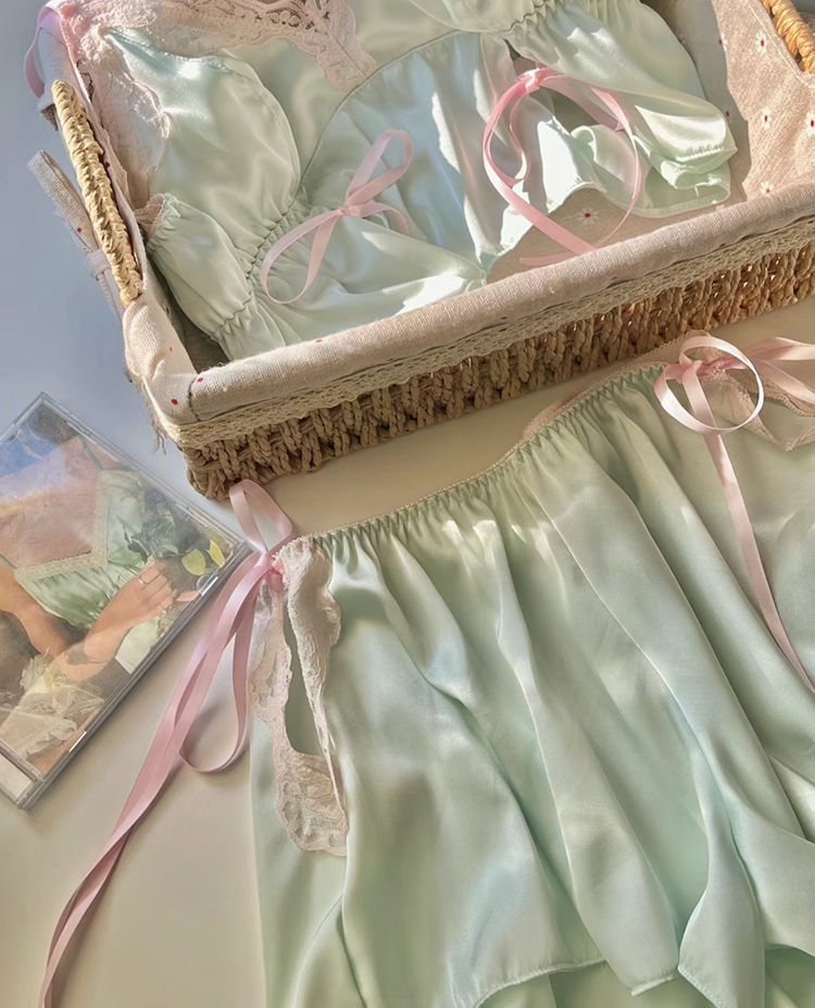 Bowknot hollow lace thin soft suspenders shorts sexy homewear suit summer pajamas two sets with bra pads with underpants