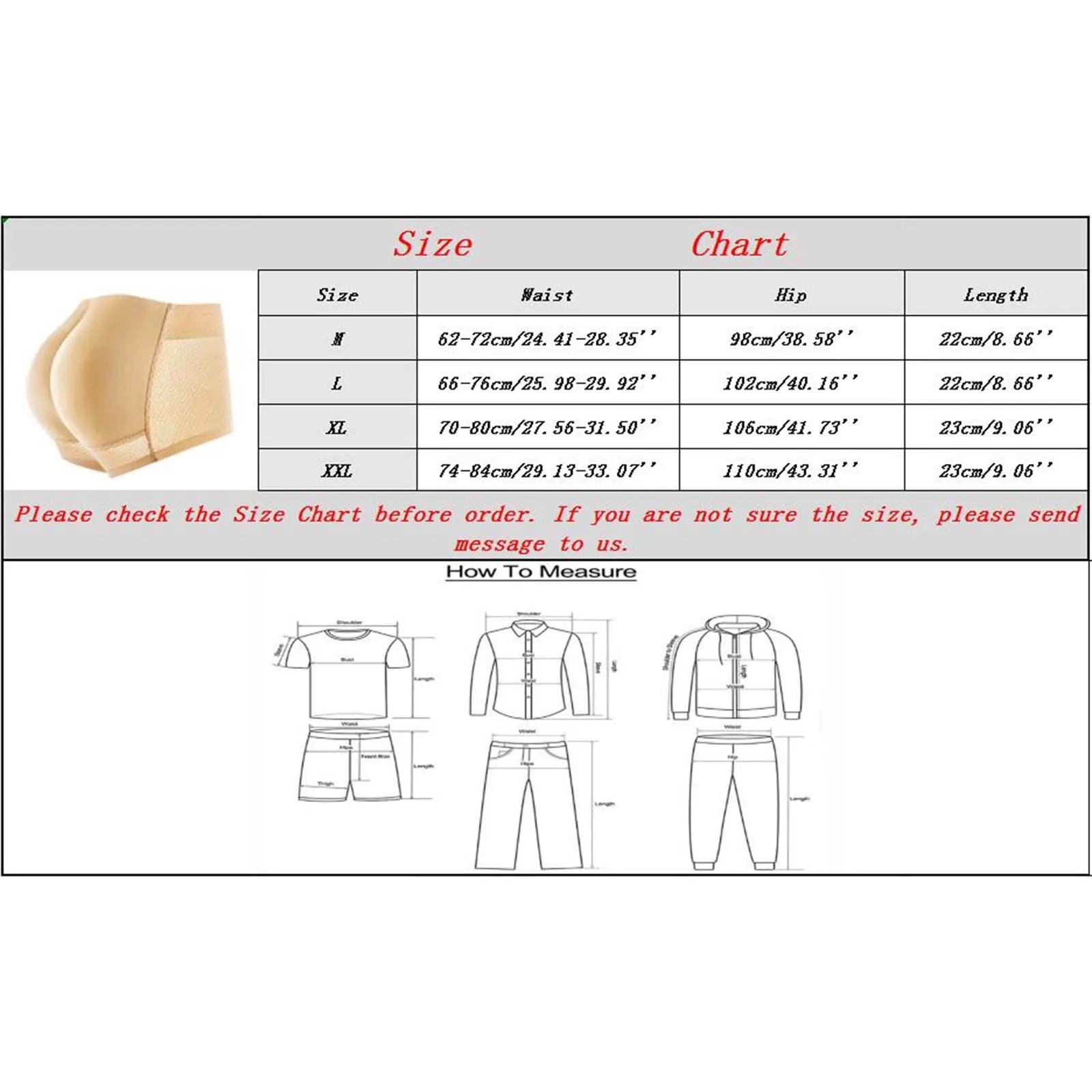| Size:M | Waist:62-72cm/24.41-28.35'' | Hip:98cm/38.58'' | Length:22cm/8.66'' |