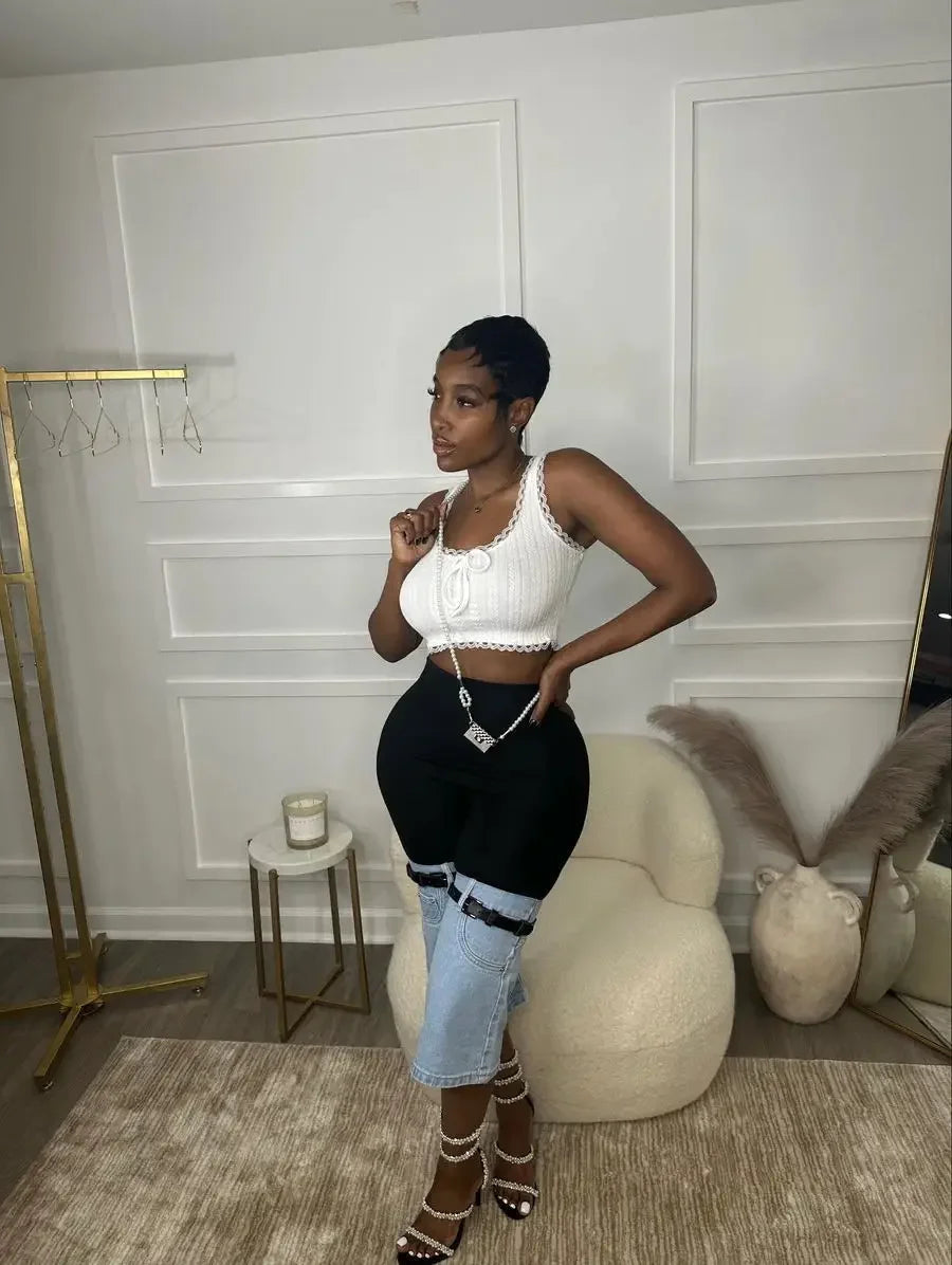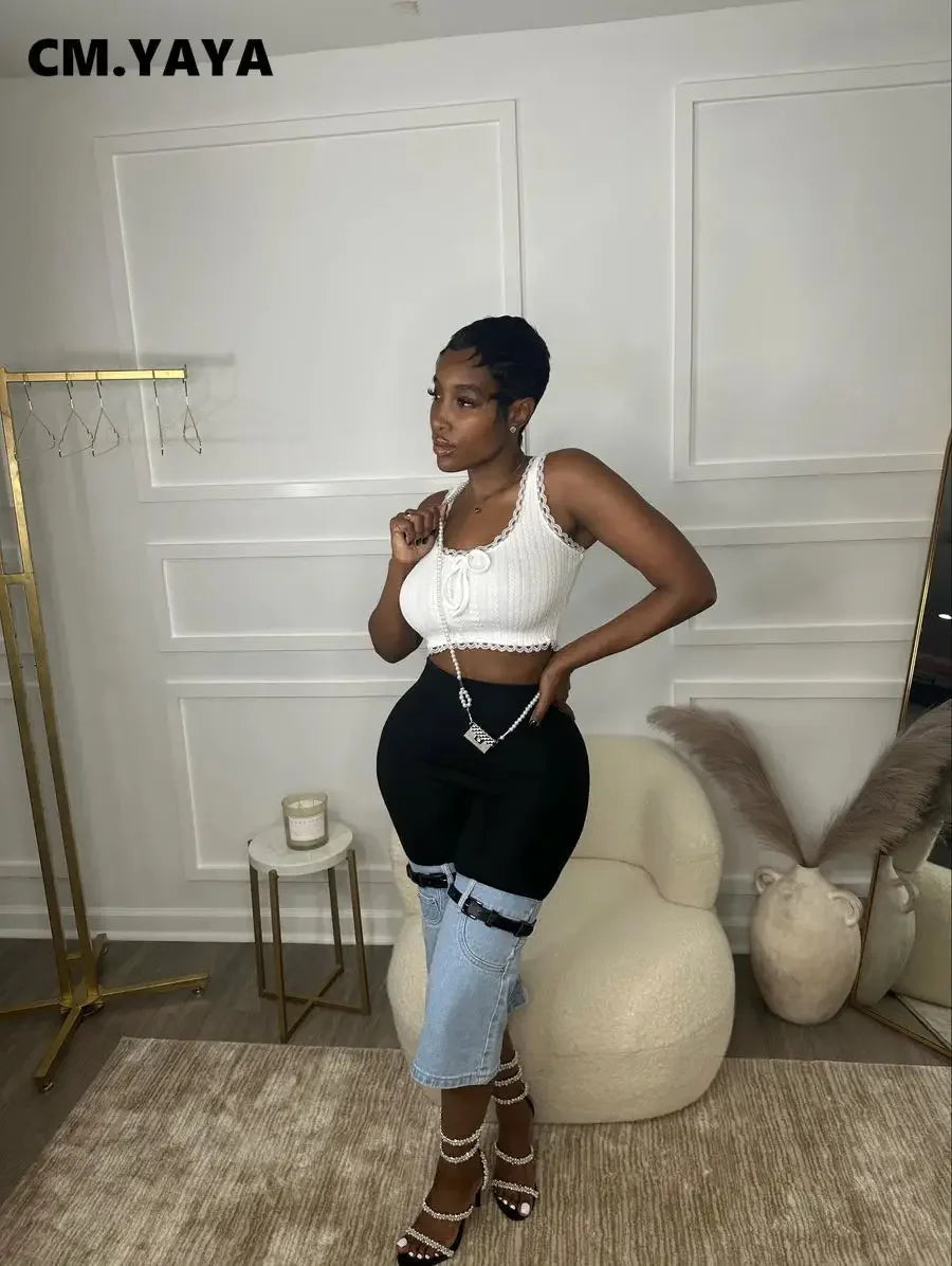 CM.YAYA Women Streetwear Ripped Jeans 2024 Summer Patchwork Chic INS High Waist Fly Calf-Length Knee Length Denim Pants