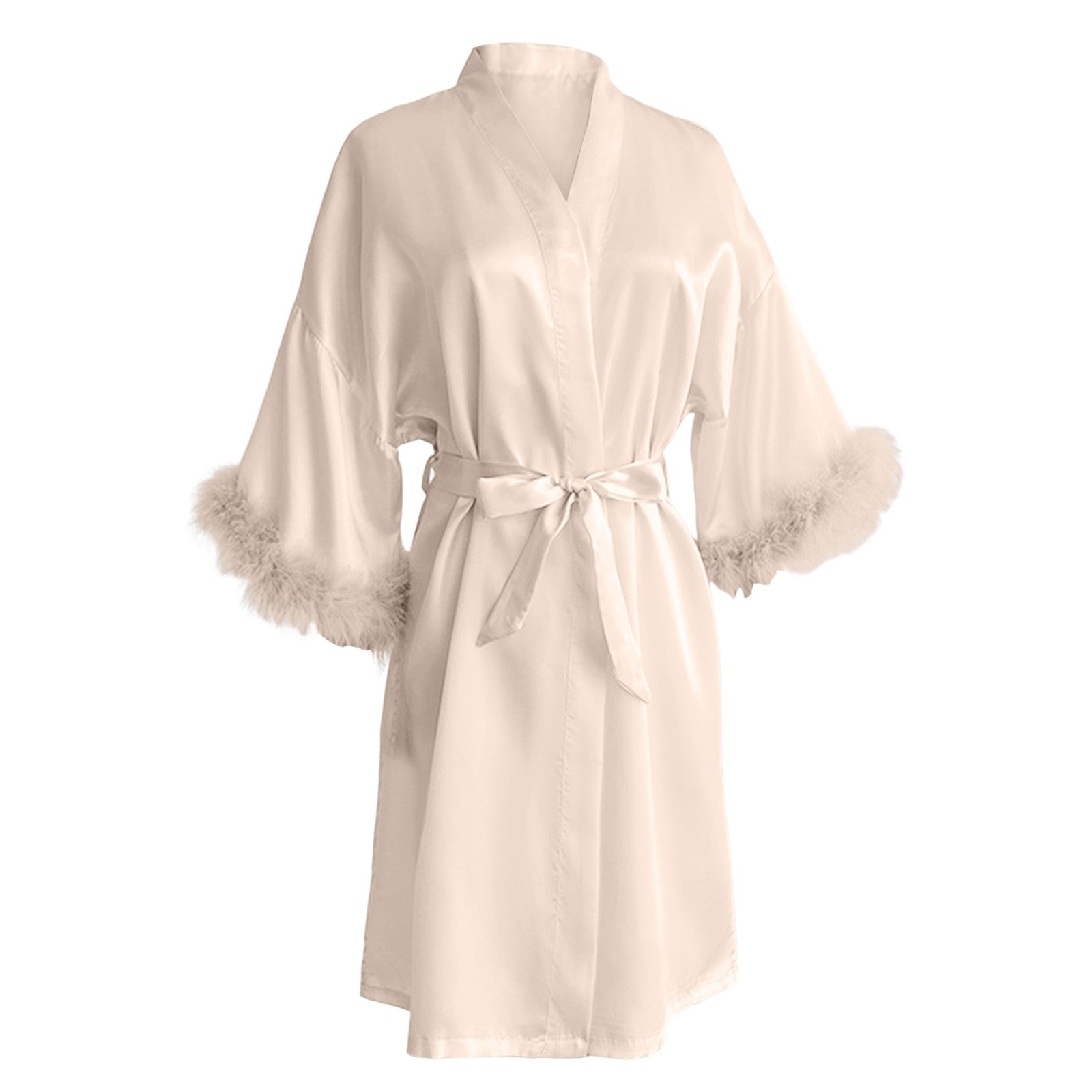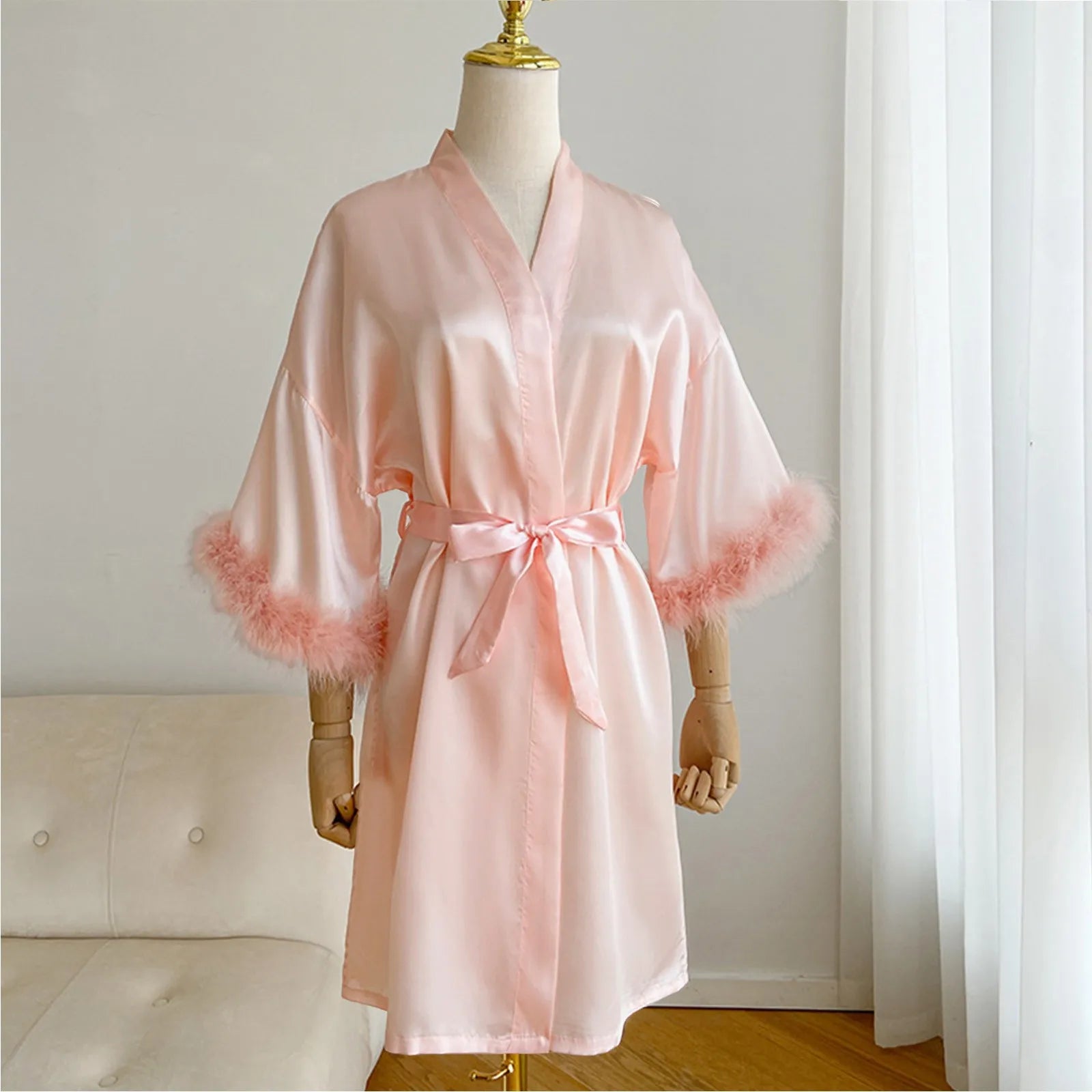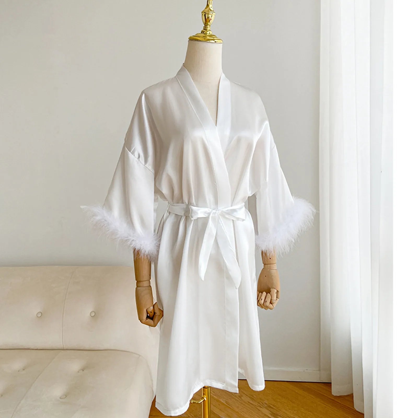 Fashion Satin Robe Female Bathrobe Sexy Lingerie Silk Kimono Bride Dressing Gown Women Sleepwear Furry 3/4 Sleeve Gown Bathrobe