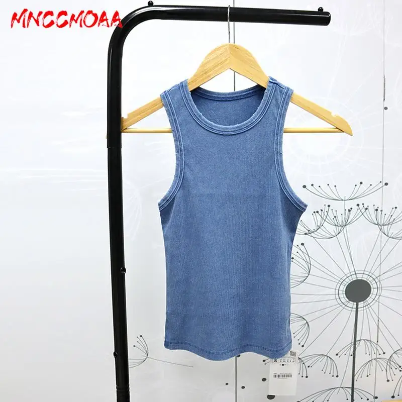 MNCCMOAA 2024 Women Vintage Blue Hole Knitted Y2k Tank Tops Sexy Slim Rib Vest Casual O-Neck Solid Female Sleeveless T Shirts