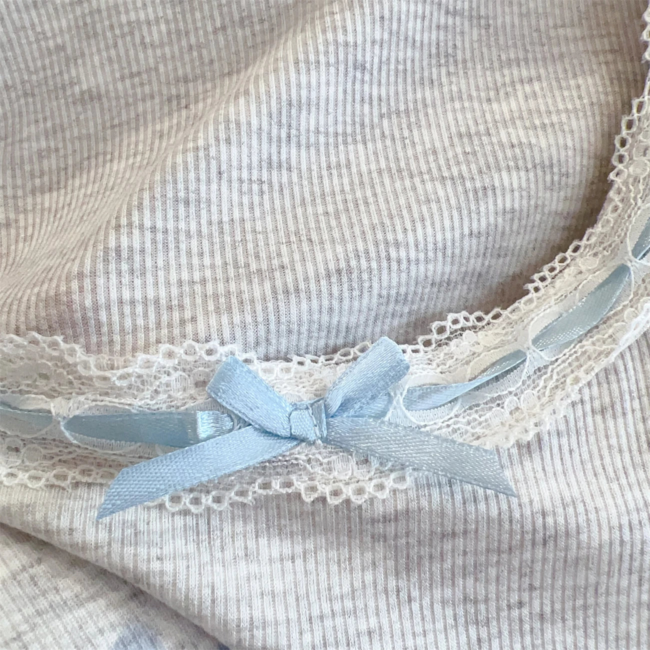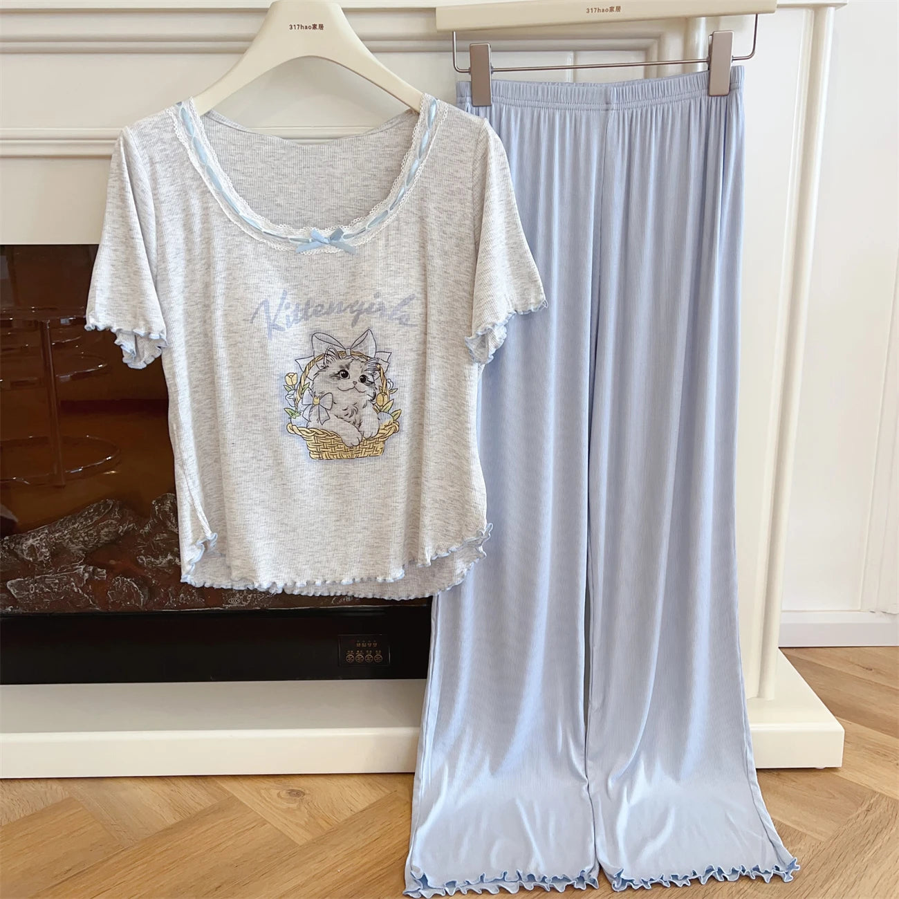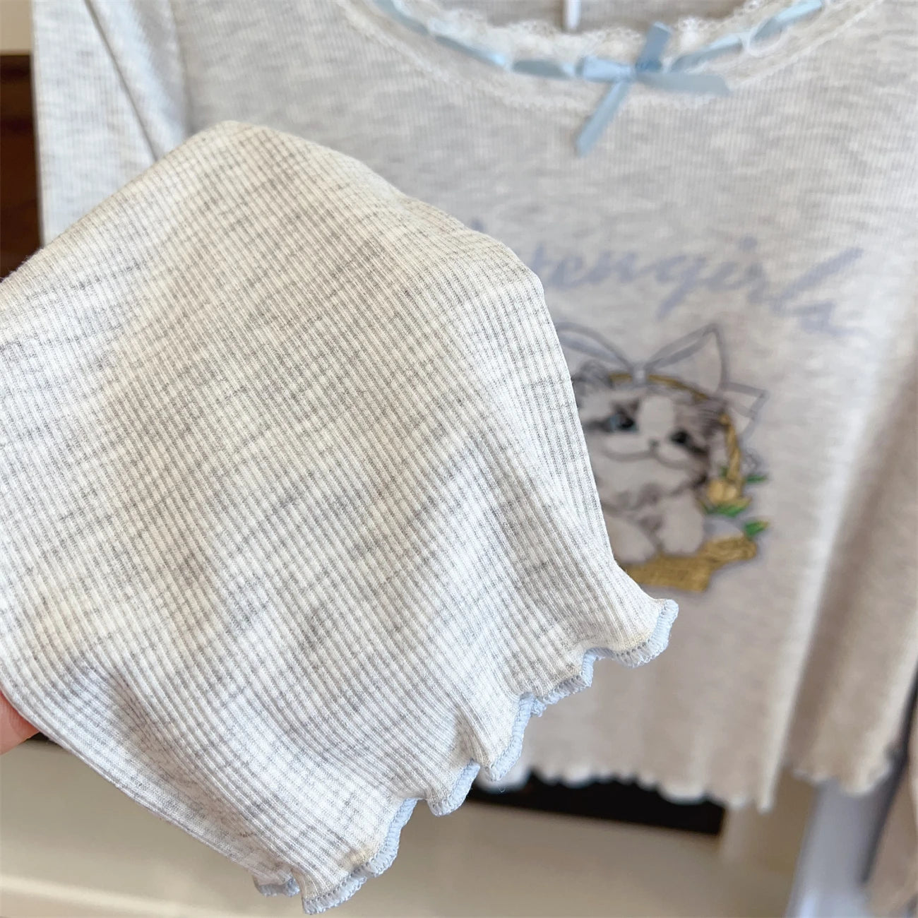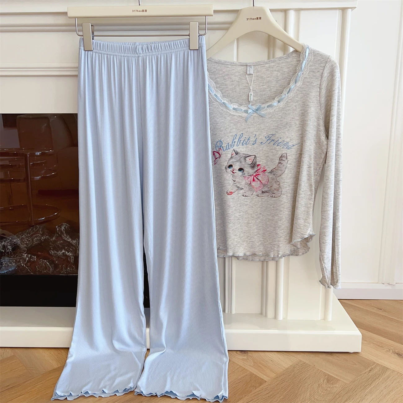 Modal Pajama Sets Sweet Cat Loose Long Sleeve Round Collar Bow Short T Shirt Women's Spring and Autumn Soft Sleepwear