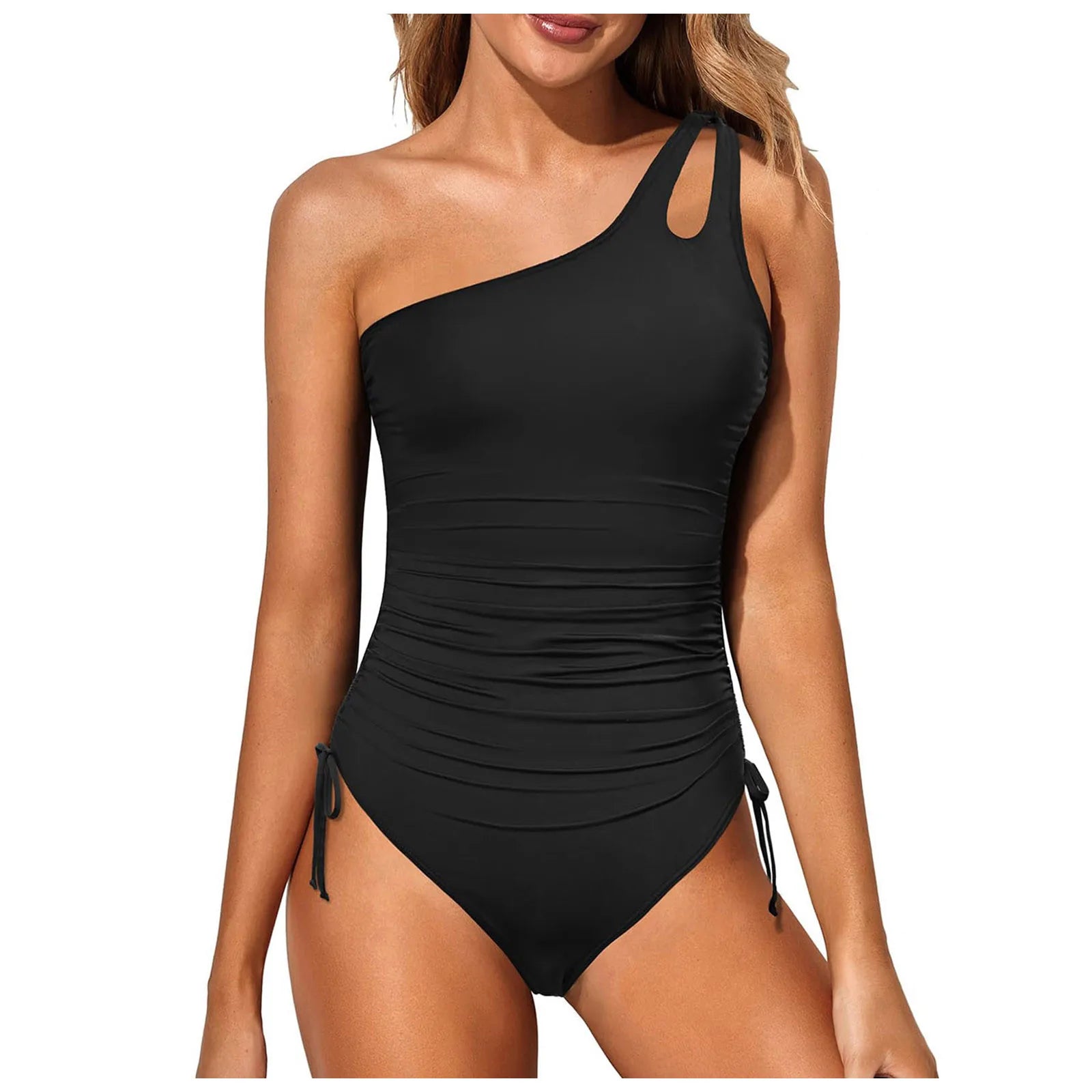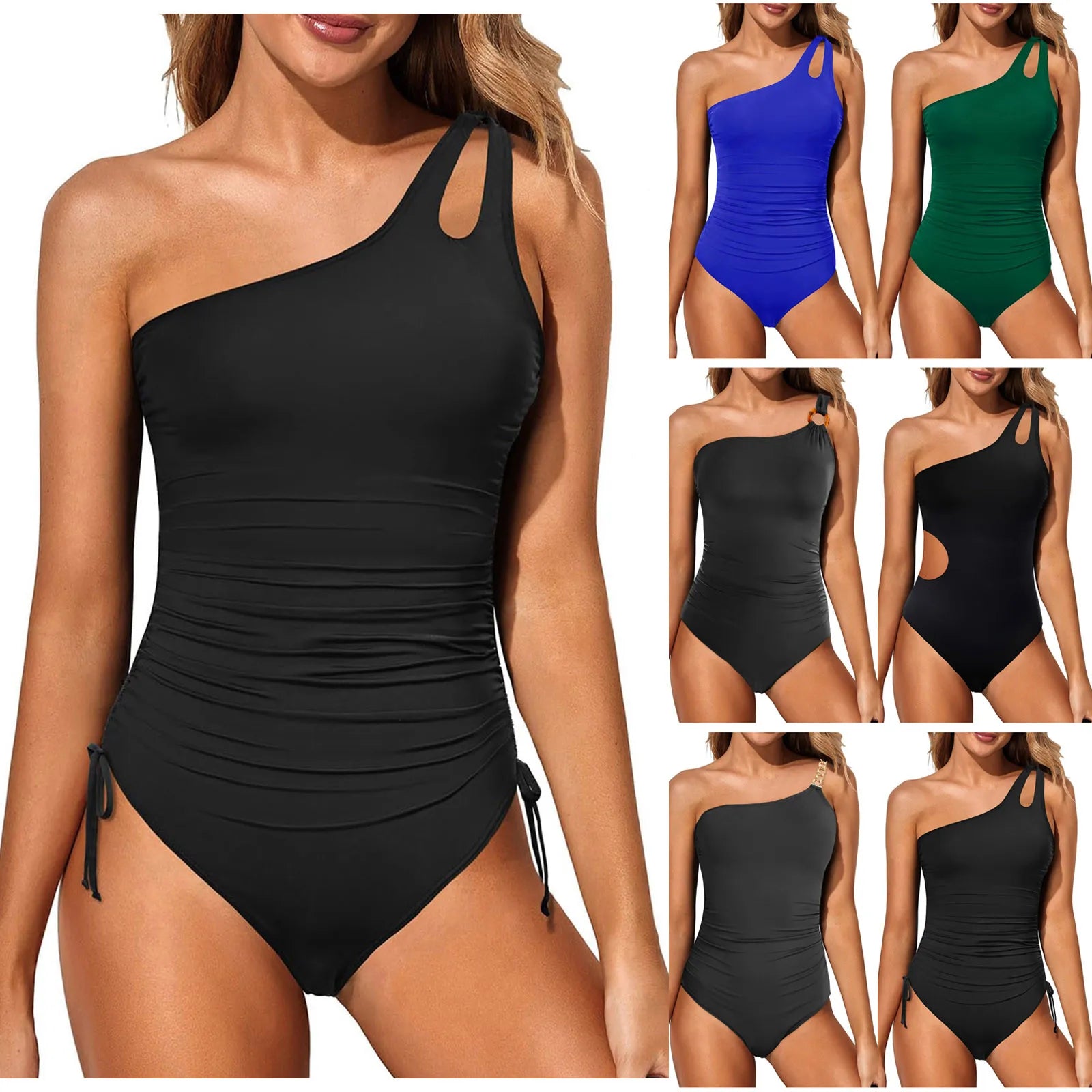 One Shoulder 1 Piece Swimsuit For Women Bathing Suits Full Coverage Swimwear Bikini Ruched Lace Up Bralette Vintage Biquinis