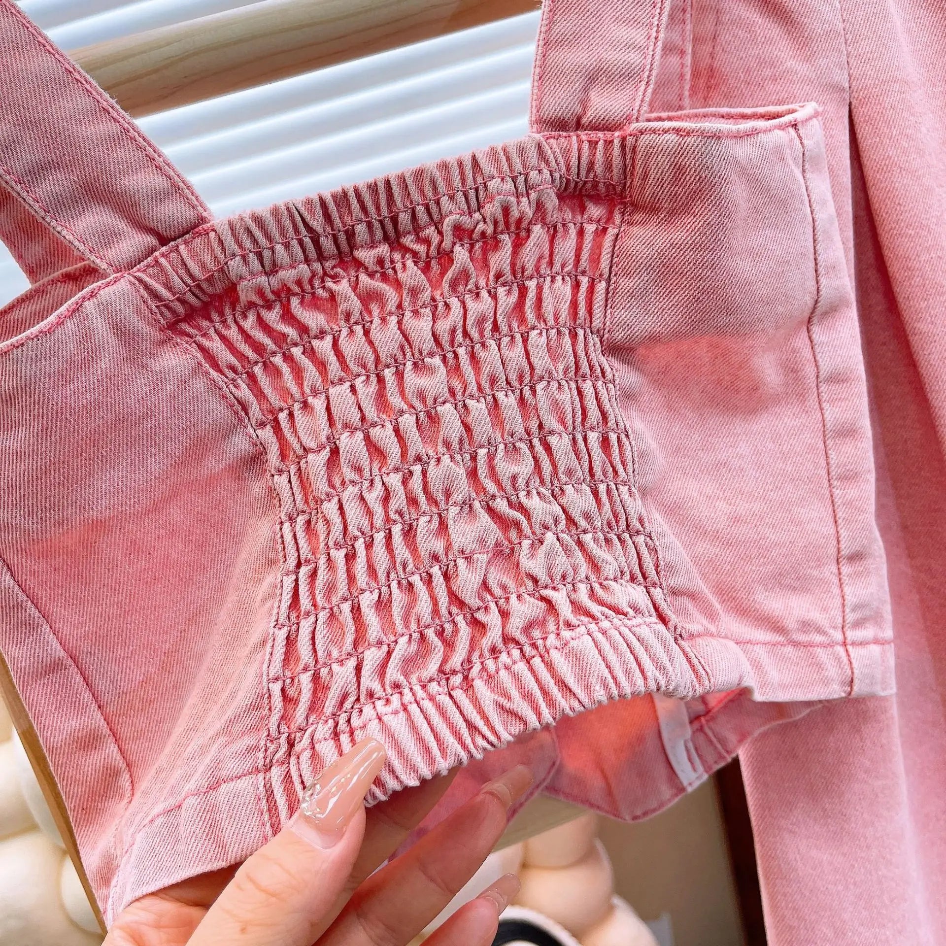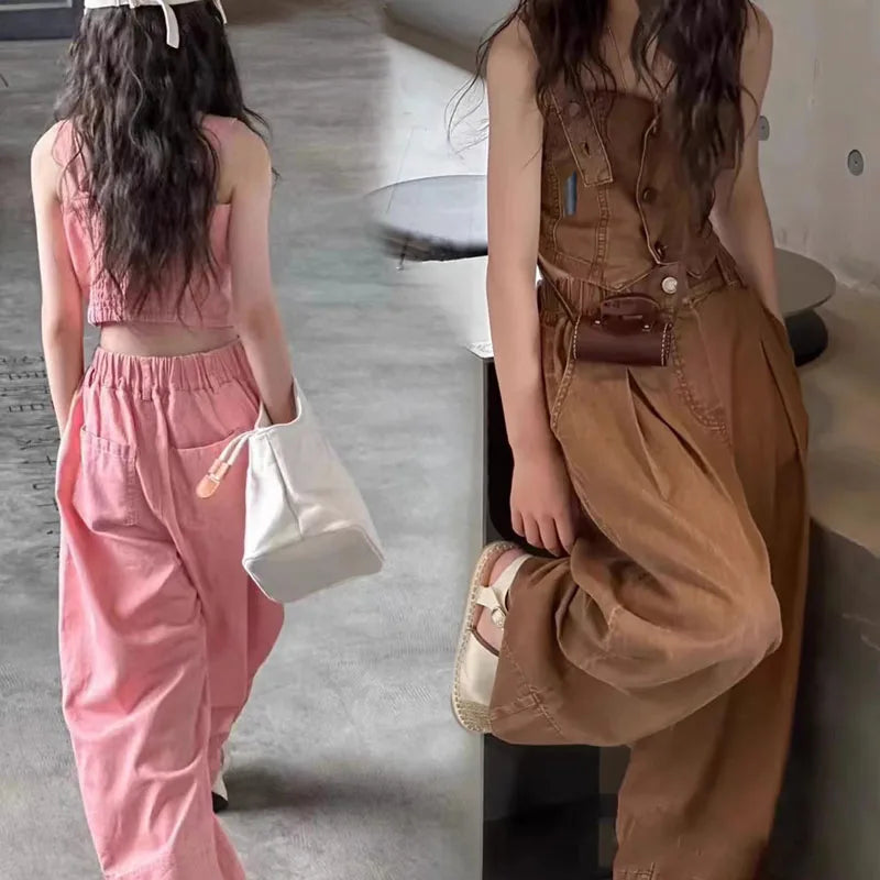 Summer New Mid size Children's Fashion Denim Set with Single breasted Sling Top +Straight leg Pants Kids Girls Clothes Suit 4-13